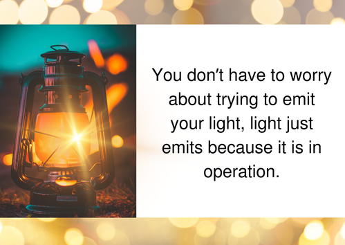 Where is your light? What is your light? Someone needs to hear your gift of song. hear an affirming word. your craftsmanship or administrative gift, your leadership style, your wit, your gift of organization, or even your gift of mercy. Whatever gift you may have, there is always room for your gift to enlighten and illuminate a space that needs it. Here is a word of encouragement, you don’t have to worry about trying to emit your light, light just emits because it is in operation. Jesus gave us these words to encourage us to shed our light: